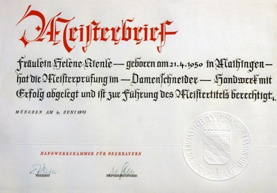 Ich bin Helene Mayer, ausgebildete Damenschneiderin. Meinen Meister habe ich 1973 in München gemacht.